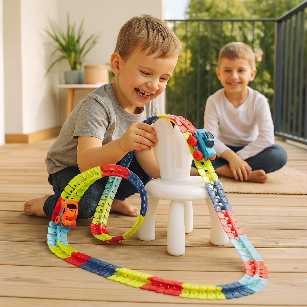 Tor można zbudować w nieskończoną liczbę sposobów – pionowo, poziomo, na stole lub po schodach. Samochodzik poradzi sobie z każdym torem, dając dzieciom satysfakcję z tworzenia i eksperymentowania.
