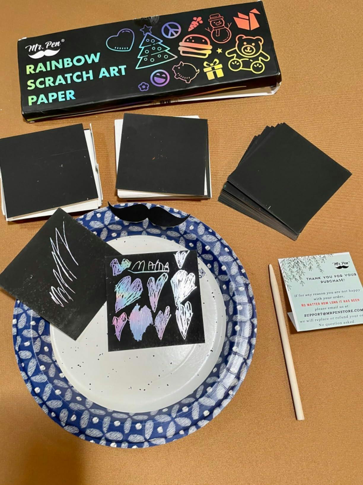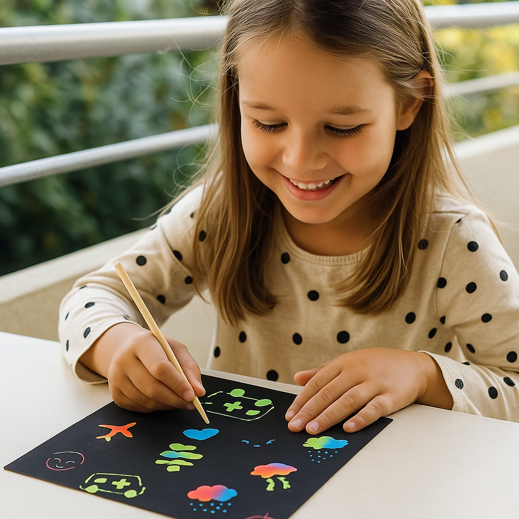 Magiczny tęczowy papier do drapania zamienia każdy projekt artystyczny w kolorową przygodę. Pod czarną powierzchnią ukryta jest żywa tęcza, która ukazuje się z każdym zadrapaniem. Idealny dla dzieci, artystów i miłośników rękodzieła – ten zestaw pobudza wyobraźnię, poprawia koncentrację i zapewnia godziny relaksującej, czystej zabawy bez bałaganu.