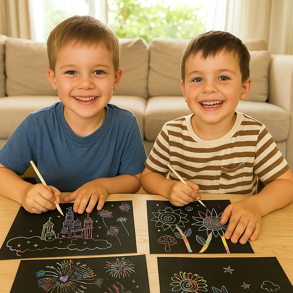 Bez farb, bez bałaganu – tylko drewniany rysik i czysta kreatywność. W domu, w szkole lub w podróży, Magiczny tęczowy papier do drapania zapewnia niekończącą się zabawę bez wysiłku.
