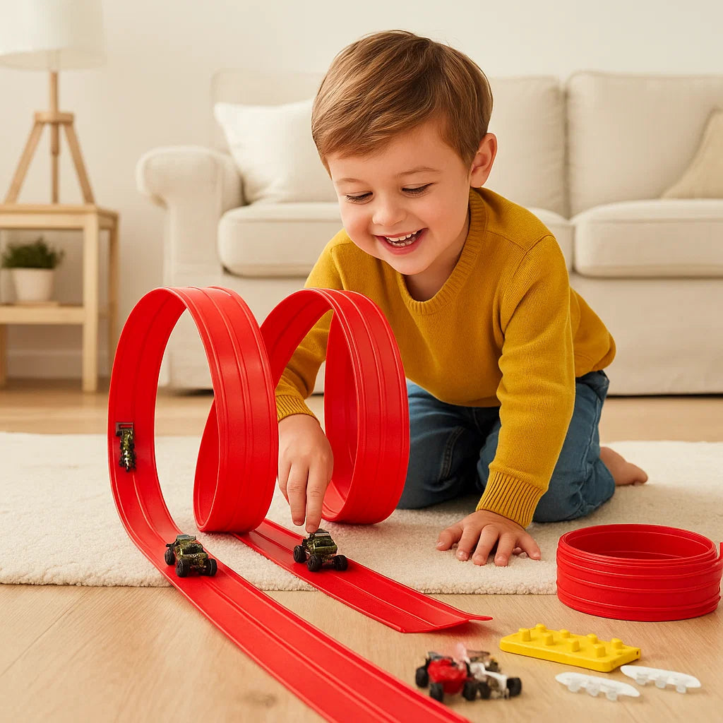 Zestaw elastycznego toru wyścigowego wnosi akcję, kreatywność i przygodę prosto do pokoju dziecięcego! Dzięki elastycznym torom i świecącym elementom każdą trasę można zaprojektować indywidualnie – pętle, zakręty czy strome zjazdy. Ten zestaw zachwyca małych kierowców i małych konstruktorów, rozwijając jednocześnie wyobraźnię, zręczność i umiejętność współpracy.